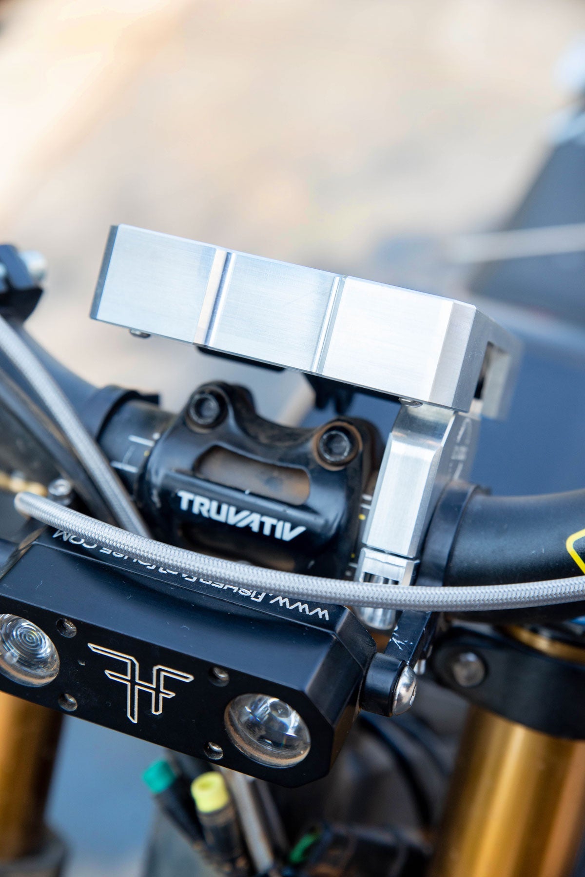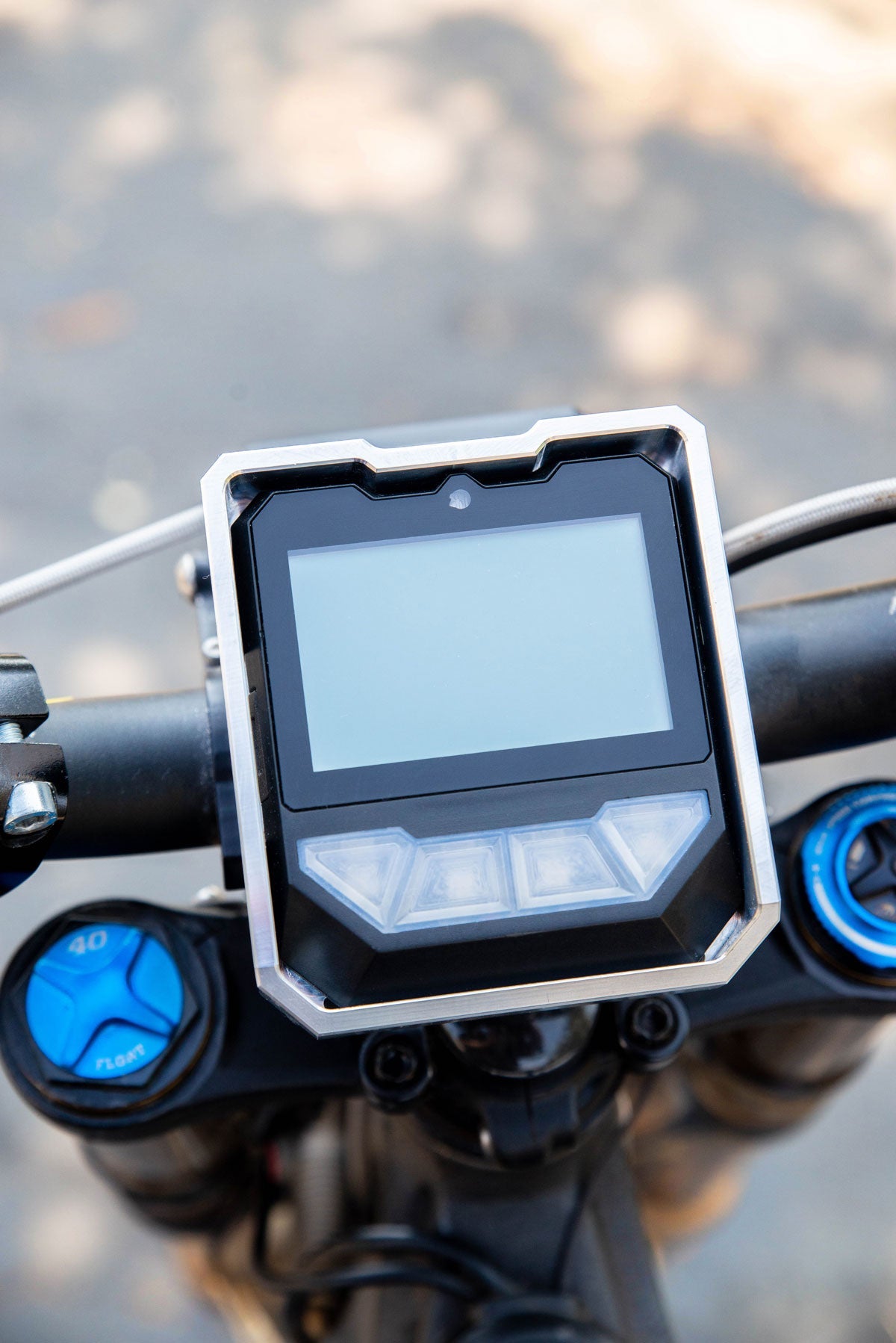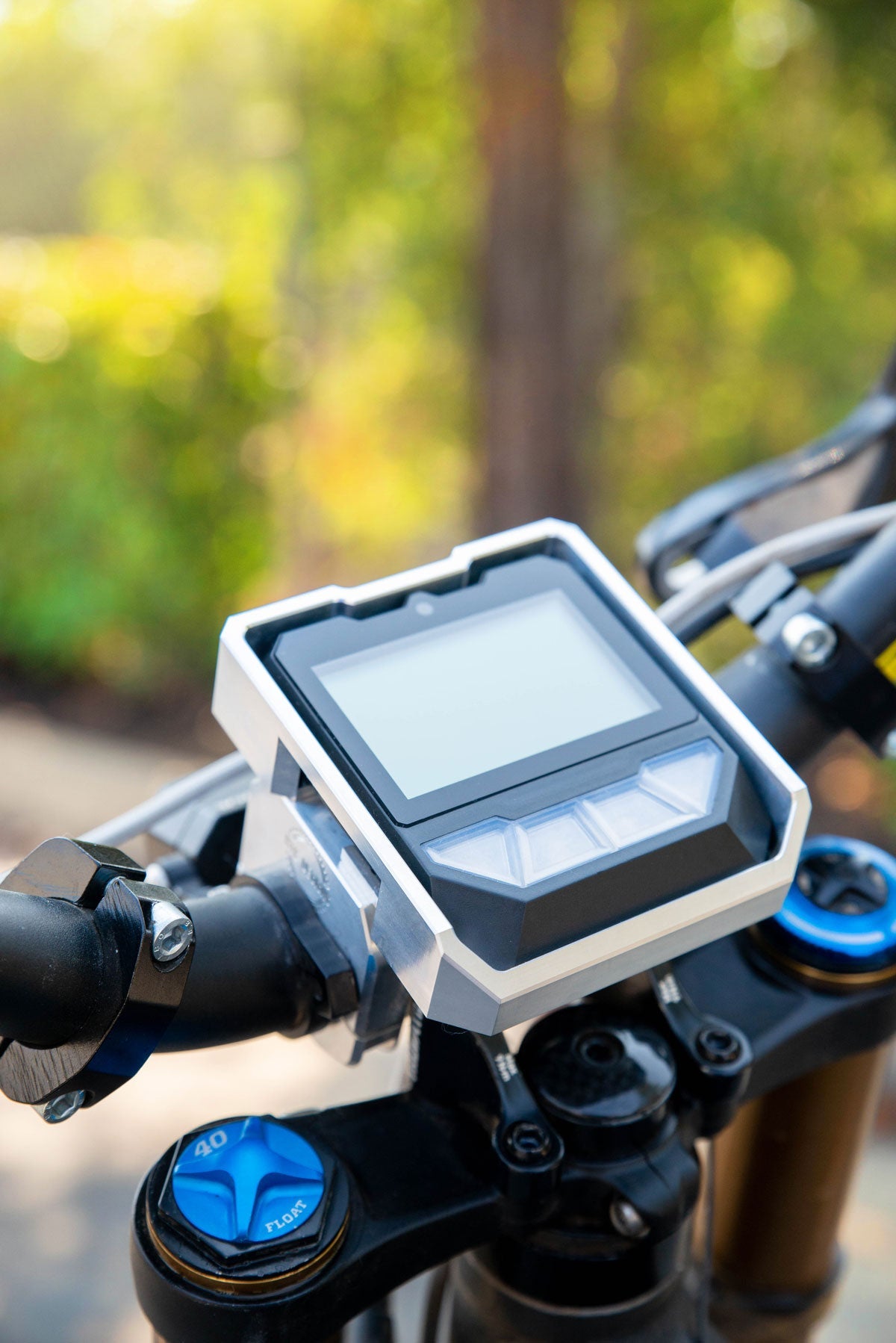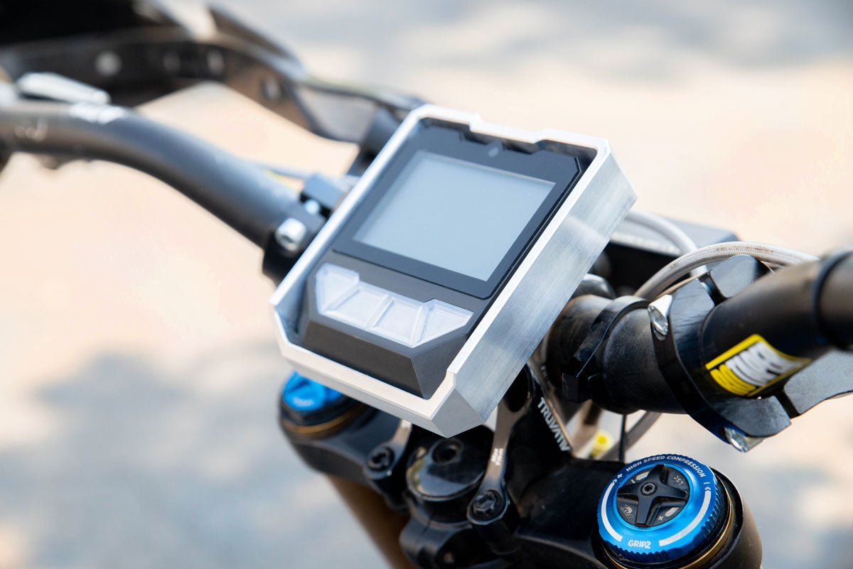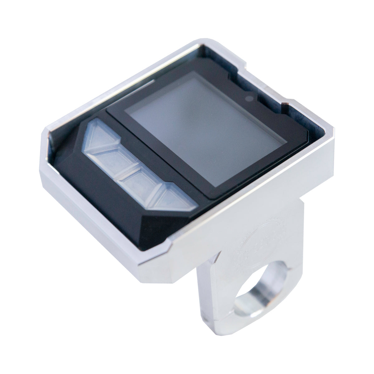 Solid 6061 billet aluminum protective case for the Nucular Display. This rugged custom case protects the plastic stock case from damage on the trail or in the garage. It also replaces the plastic bar clamp with an all-aluminum screw clamp (similar to the brake lever clamp).