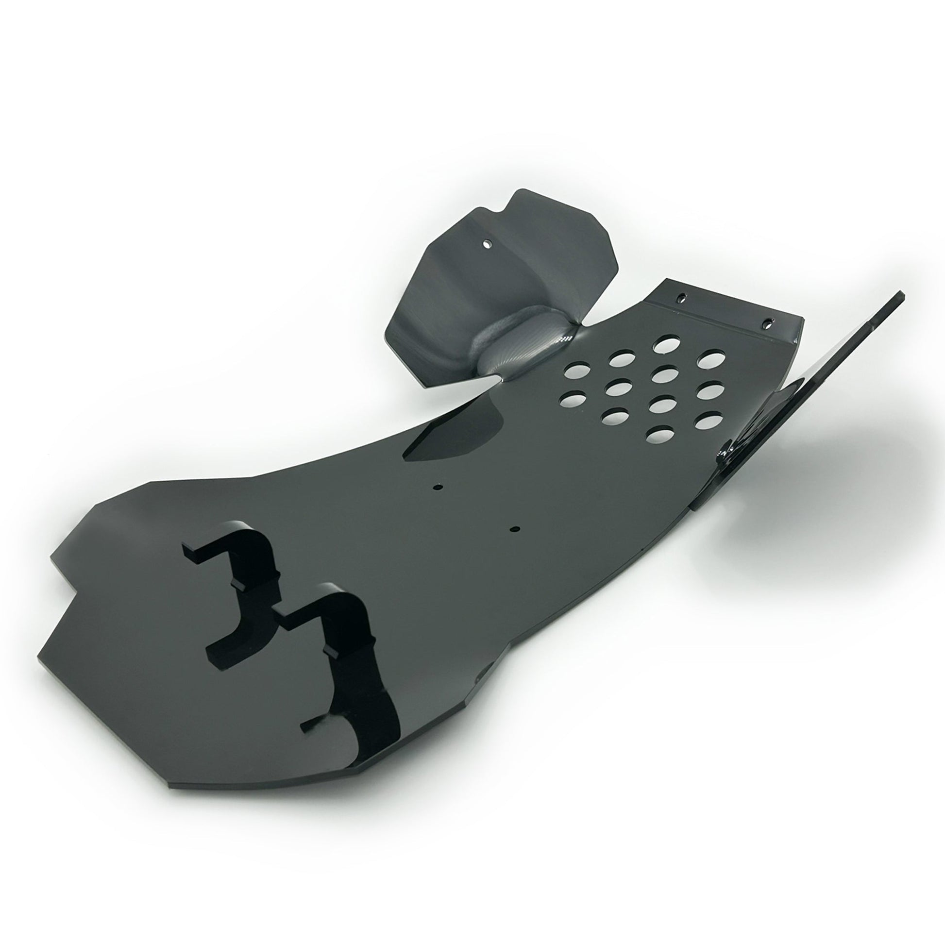Delrin hooks hold the back plate to the frame while a center load block distributes the force evenly to the skid frame. Sides and front mount to the stock locations making it a solid piece of the bike.