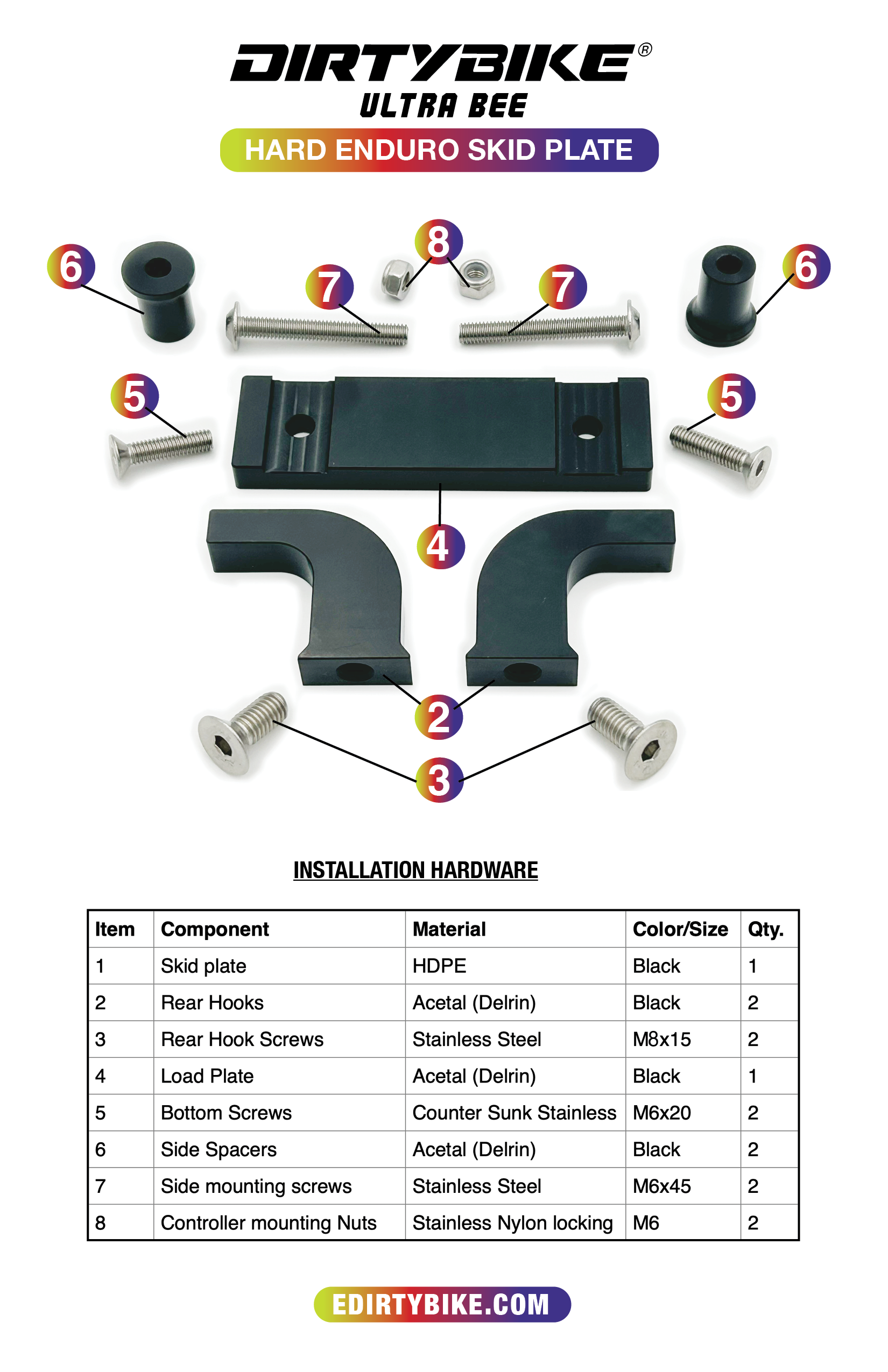 DirtyBike's skid plate is not messing around. It took us 24 design iterations to develop this skid plate for maximum durability and component protection. Our solid attachment uses 8 mounting points where competitors use only 4.
